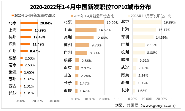 2020-2022年1-4月中国新发职位TOP10城市分布