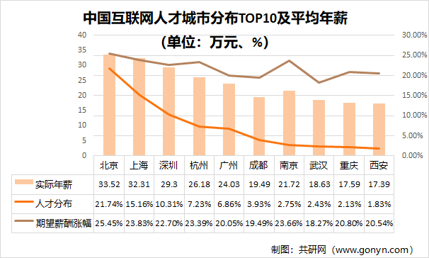 中国互联网人才城市分布TOP10及平均年薪(单位:万元)