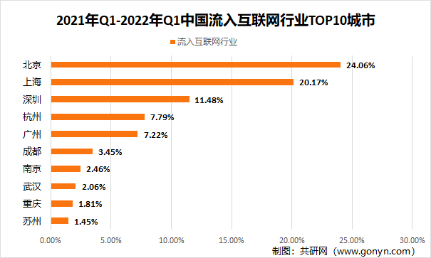 2021年Q1-2022年Q1中国流入互联网行业TOP10城市