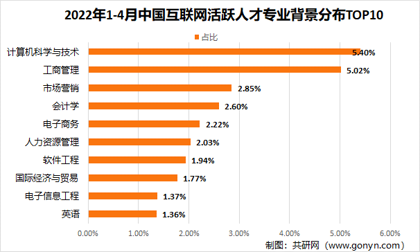 2022年1-4月中国互联网活跃人才专业背景分布TOP10