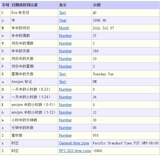 日期和时间格式由 日期和时间模式字符串 指定。在 日期和时间模式字符串 中,未加引号的字母 'A' 到 'Z' 和 'a' 到 'z' 被解释为模式字母,用来表示日期或时间字符串元素。文本可以使用单引号 (') 引起来,以免进行解释。所有其他字符均不解释;只是在格式化时将它们简单复制到输出字符串