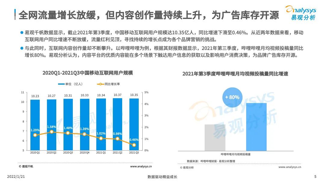 摘要:数据显示,截止2021年第3季度,中国移动互联网用户规模达10.35亿人,同比增速下滑至0.46%。从近两年数据来看,移动互联网用户同比增速不断放缓,流量红利见顶,寻找持续的增长点成为各个品牌营销的挑战。与此同时,互联网内容创作量却不断攀升。内容平台的优质内容能在多个场景下触达用户信息的获取以及影响用户消费决策,为品牌广告库存开源。