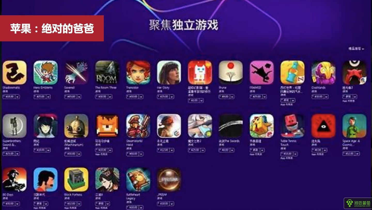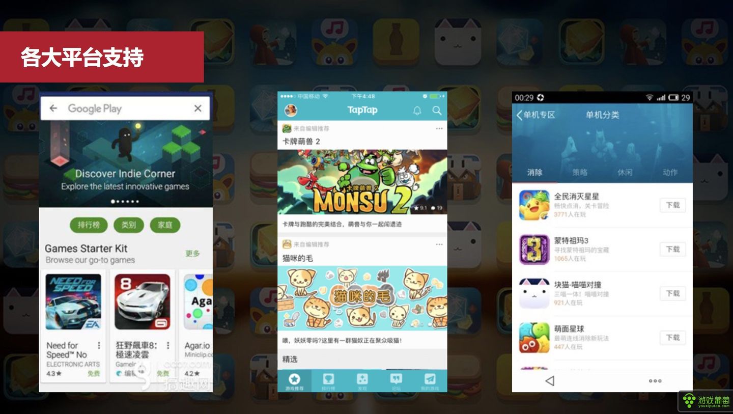 第二部分,我们来看平台的支持。苹果现在是绝对的爸爸,它甚至新开了独立游戏专区。Steam用户量很大,很多国内团队也在尝试做Steam付费下载游戏,但它的用户数量和手机完全不能比。毕竟Steam一般是付费下载,对产品质量要求很高,而苹果有一个缓冲,我们可以慢慢来,它对独立游戏有很多帮助。