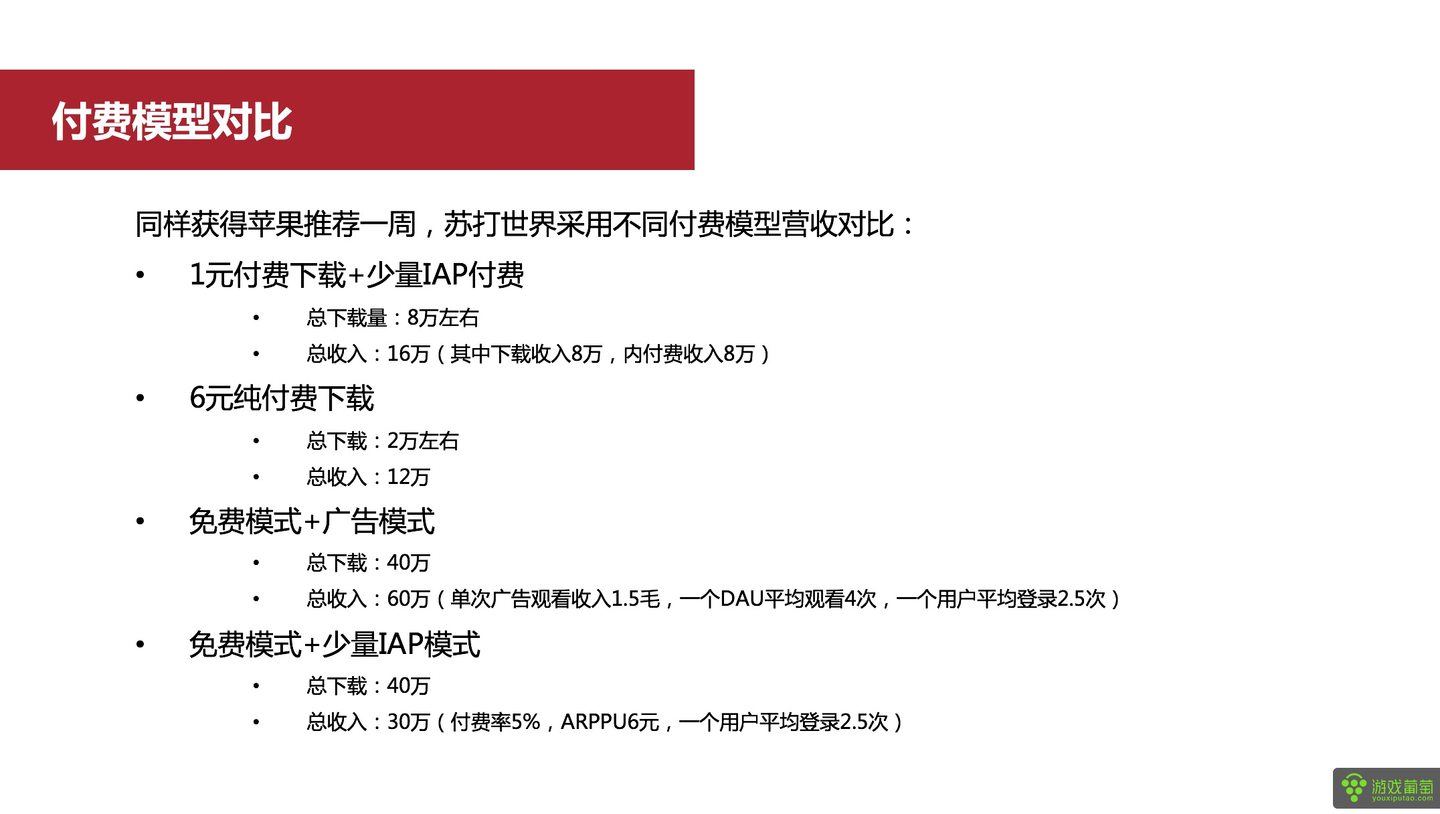 然后你要考虑你的商业模型。商业模型其实有标准套路,适合哪个就用哪个。你选完之后赚钱的事情就解决了,就可以去把心思放在体验创新上面。这里列了我们《苏打世界》当时自己的付费模型评估,大家可以自己看。
