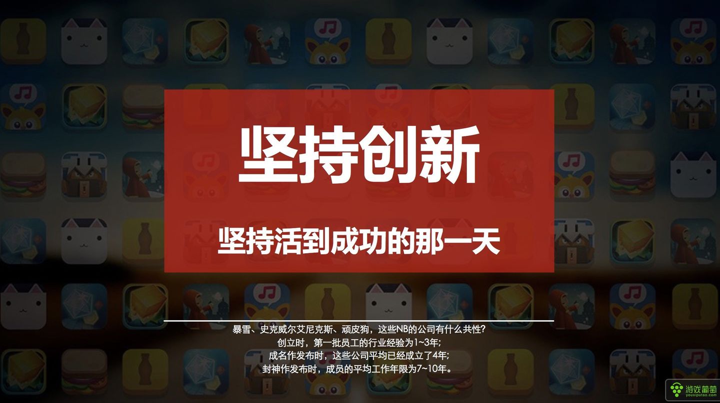 最后依然送给大家我经常在演讲中留在结尾的一句话:对于做独立游戏的人就是这两条,你要坚持创新,无论什么状态你都要坚持情怀;但你也要有能力包装它,你要坚持活到成功的那一天。