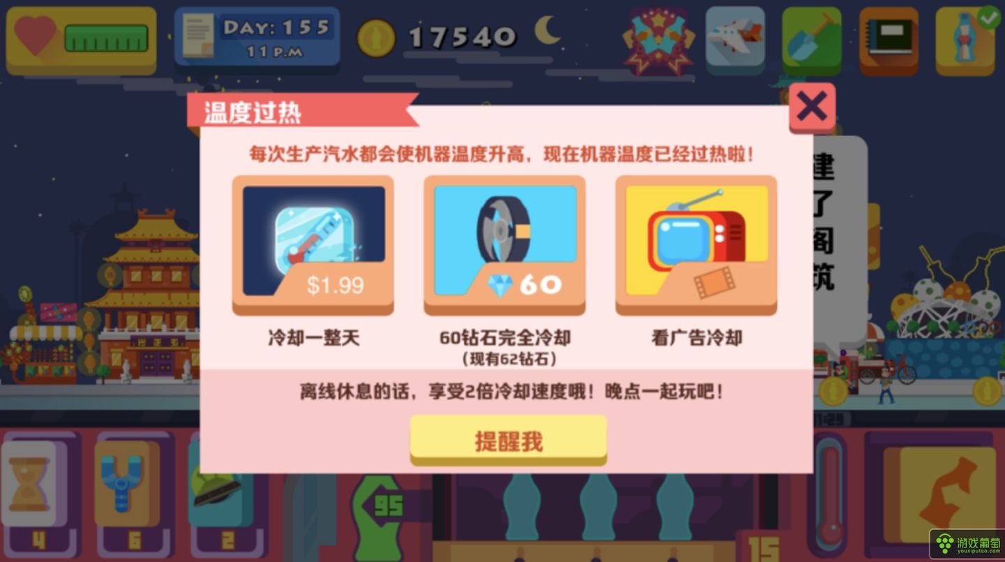 再看我们自家的《苏打世界》。游戏是免费下载,但我们也做了一个类似体力系统的设计。如果你一直生产汽水,那机器就会过热,你必须让它冷却。你可以等待,花钱,也可以通过看广告解决这个问题。