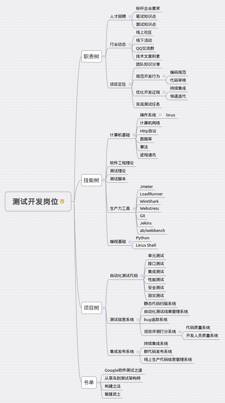 通过对更多的高端测试岗位的技能要求做总结,绘制出如下的一个技能和事务树,供大家参考: