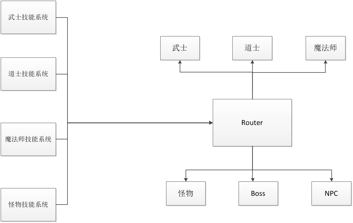 图中显示的各个技能系统是需要自己封装的,Router 是所有技能对外的逻辑接口,它是联系各个技能系统与对应角色逻辑的纽带。不论是 NPC 和玩家角色,它们都需要调用 Router 函数中的接口去实现技能逻辑。Router 与 NPC 和玩家之间的关联,我采用的是消息传送的方式,就是说如果需要用到 Router 中的函数可以通过消息发送的方式进行,这样减少了模块之间的耦合性。一旦有需求变化只需要维护好 Router 类即可。在这里友情的给读者提示一下注意事项,在重构代码时,不要把整个项目重构,那样很容易破坏项目的整体性而且容易造成功能细节丢失,导致经过重构后的项目被废弃。如果出现这样的结果,还不如不重构。一般重构代码时,先把需要重构的模块熟悉了才动手做,而且重构时以模块为单位去重构代码,采取各个击破的方式,重构后的游戏项目在扩展性方面明显改善。所以说游戏架构对于产品来说是非常重要的,游戏产品上线只是第一步,后期版本迭代才考验你产品架构设计的好坏。在这里不是给读者介绍如何架构好,而是做适合于你游戏产品本身的架构设计。
