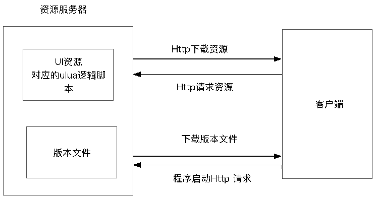 实现思路:客户端启动时,首先通过 Http 协议从服务器下载版本文件与本地的版本文件进行版本比较,把需要下载的资源加入到链表中。然后再通过 Http 协议去服务器请求资源下载,将资源从资源服务器下载存到手机本地供客户端加载使用。在 UI 加载时由于 ulua 自身的问题,程序直接加载 UI 资源比较缓慢,在这里我是用的预加载方式就是资源更新完成后,将 UI 资源大部分预加载到内存中并将其设置为不可见,在 UI 切换时直接设置为可见即可,明显提升了效率。还有一个问题是 ulua 的内存释放要及时,防止占用内存过多影响效率。