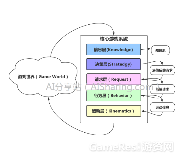 有了这五层的设计,整个核心游戏系统的更新循环就完成了,并且每一层的功能职责和输入输出都有了明确的定义,如下图: