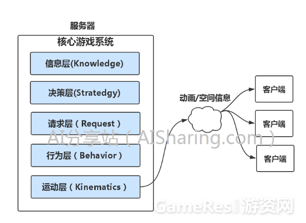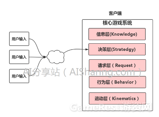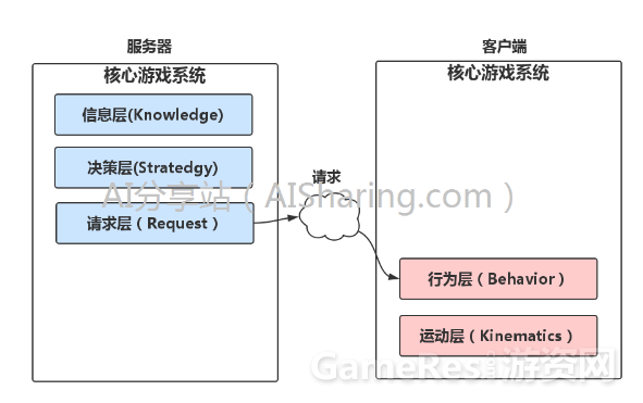 决策层就是负责来决策此时该智能体应该要做什么,比如我要走到某个位置,我要攻击,放技能等等,可以说,这就是传统所说的人工智能AI部分,这部分只根据当前所有的世界信息,产生“做什么”的决策,决策的内容会封装在一个“请求”(Request)的结构中,继续向下传递: