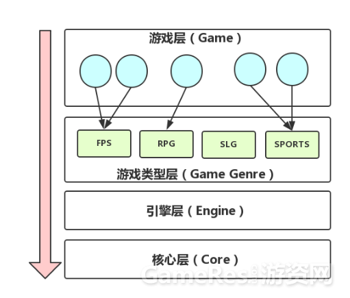 核心游戏系统架构也可以用这样的思路来设计,这样每一层都可以由不同的人来负责,如果实现的话,在一层当中也可以进行任务分工,那下面我就根据执行顺序,自上而下一层一层来描述。