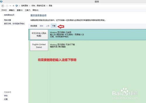 6、下移之后再选中中文(中华人民共和国)输入法组-删除,即可将包含微软拼音输入法的语言组删除,也就将Win8自带的微软拼音输入法从系统删除了