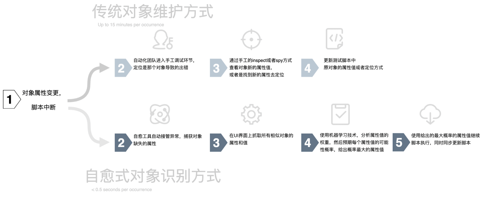 通过这个案例,我们来对比一下传统自动化测试方式和基于自愈技术的自动化测试方式中对象维护的差异(如下图所示):