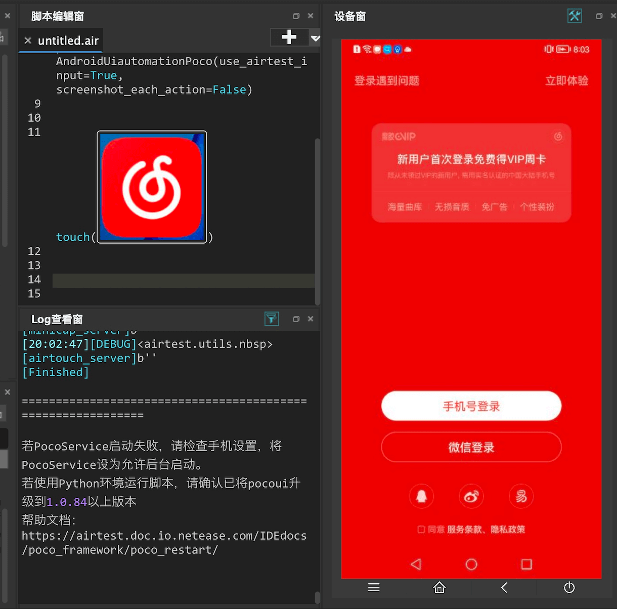 如下这个例子:在Airtest中操作网易云音乐APP :