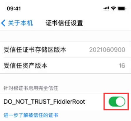 (3)进入手机设置 -> 通用 -> 关于本机 -> 证书信任设置,勾选DO_NOT_TRUST_FiddlerRoot