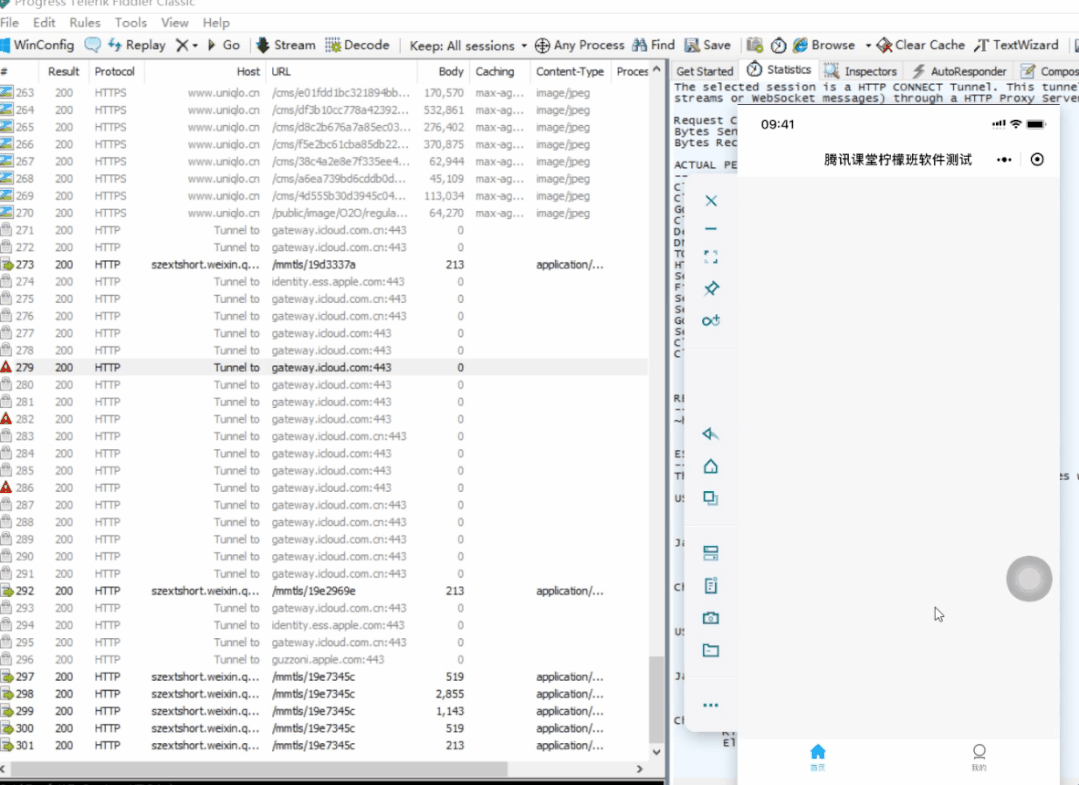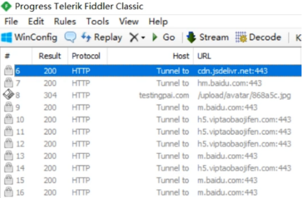 Fiddler端请求呈灰色显示状态,并且提示Tunnel To(表示建立https链接隧道中)