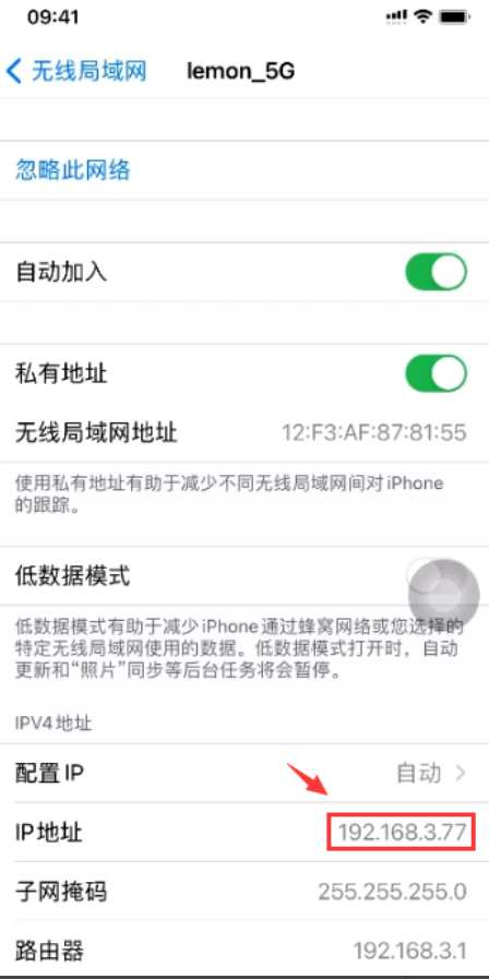 一般电脑和移动端设备连接到同一个WiFi热点(路由器),就可以保证是在同一局域网中,这里我们可以通过手机设置->无线局域网->选择对应热点,查看设备IP地址: