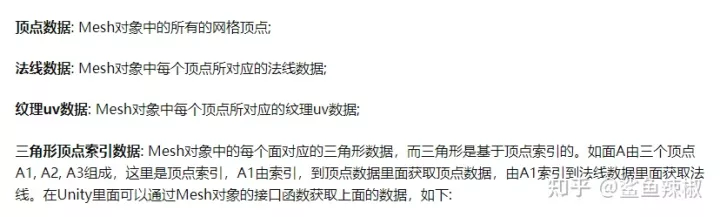在详细的讲解Mesh切割算法之前,先给大家讲解一下一个模型的Mesh数据主要包含哪些部分,等下生成新的Mesh的时候,我们知道每一部分的数据都代表什么。Unity中网格数据被生成到Mesh对象里面,一个Mesh对象主要包含以下重要的数据:
