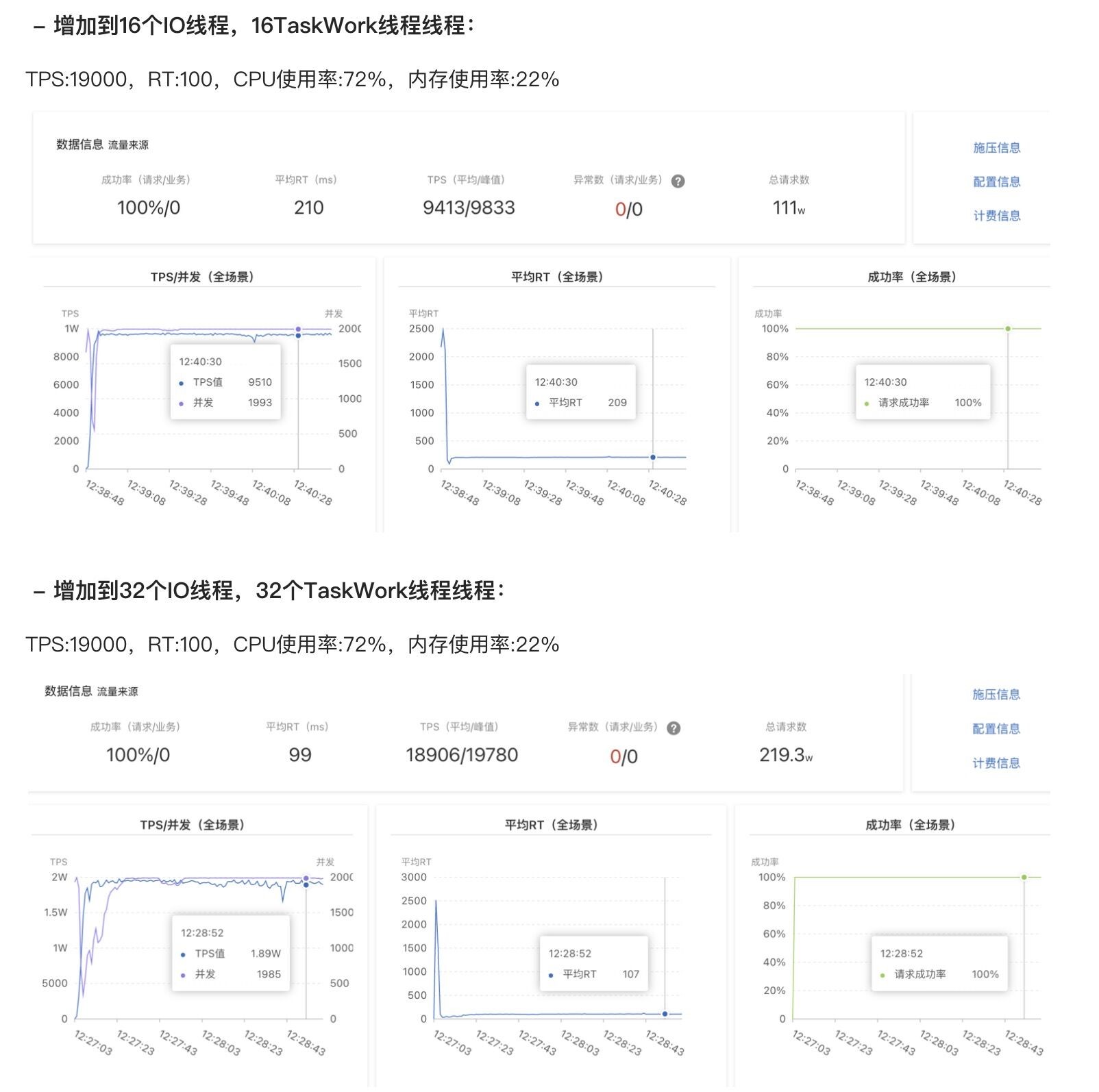 大概估摸计算以后,我就让小伙伴加大逻辑处理线程与IO线程,然后对比,如图: