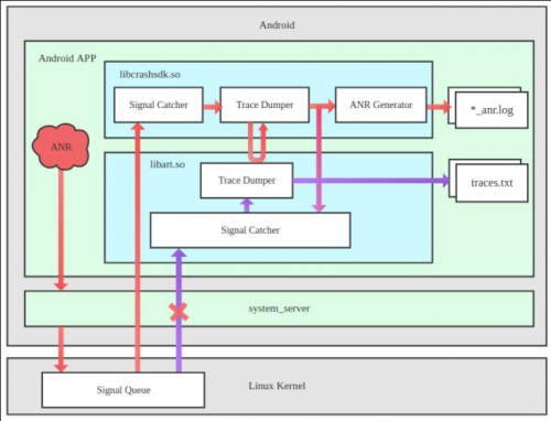 如下图,红色线为 U-APM SDK 处理 ANR 信号和生成 ANR 日志的流程,紫色线为系统生成 ANR traces.txt 的流程。