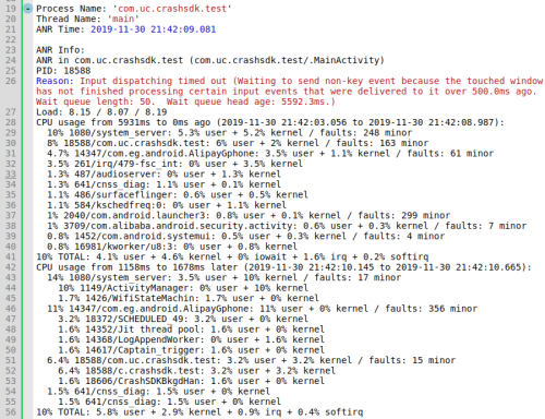 这部分内容主要从系统获取,其包含了 ANR 的进程名、ANR 产生的时间、ANR 的原因、ANR 前后几秒内系统 TOP 进程的 CPU 使用率等。其中,通过 ANR 原因可以得知是输入事件处理超时,还是 BroadcastReceiver 等其它消息处理时间过长;通过 CPU 使用率则可以得知是哪个进程占用 CPU 资源过多。