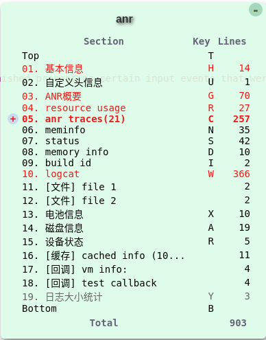 使用日志分析插件,我们可以清晰地看到 生成的 ANR 日志包含的内容以及重点信息,如下: