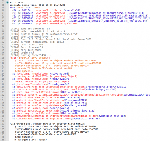 traces 信息是 ANR 日志中最关键的内容。如U-APM生成的 traces 信息包含了出现 ANR 时主线程的 native 调用栈和所有线程的 java 调用栈。通常死锁问题通过调用栈中的信息可以很容易发现。