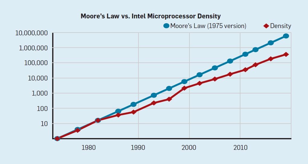 摩尔(Gordon Moore)在 1965 年的最初预测中,称晶体管密度会每年翻一番;1975 年,他又预计每两年翻一番。