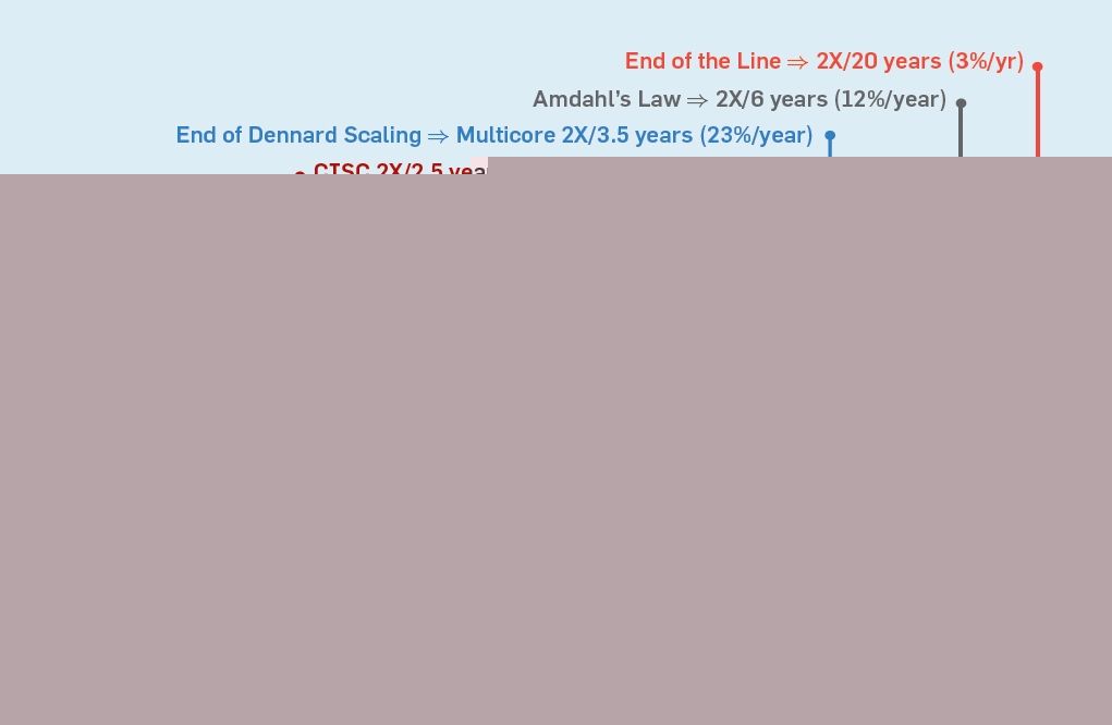 1986 年至 2002 年间,指令级并行(ILP)是提高性能的主要架构方法。而且随着晶体管速度的提高,其性能每年能提高 50% 左右。登纳德缩放定律的终结意味着工程师必须找到更加高效的并行化利用方法。