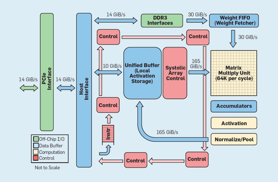 作为 DSA 的示例,我们可以考虑谷歌 TPU 1 的设计,它旨在加速神经网络的推断过程。TPU 自 2015 年投入生产,它从搜索引擎到语言翻译和图像识别支持着谷歌各种各样的业务,同时也支持着 AlphaGo 和 AlphaZero 等 DeepMind 前沿研究。