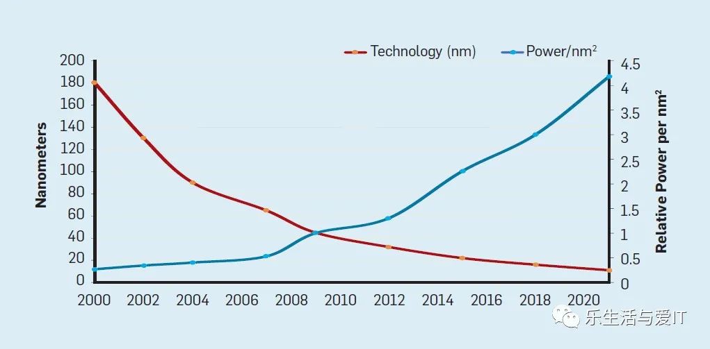 图 3. 每个芯片上的晶体管及每平方毫米的能耗。