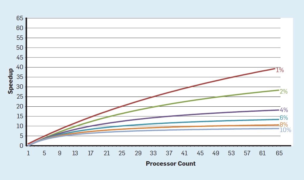 多核将识别并行性和决定如何利用并行性的责任转移给程序员和语言系统。多核并不能解决由登纳德缩放定律终结带来的能效计算挑战。每个活跃的核都会消耗能量,无论其对计算是否具有有效贡献。一个主要的障碍可以用阿姆达尔定律(Amdahl's Law)表述,该定理认为,并行计算机的加速受限于序列计算的部分。这一定律的重要性参见图 5。图中显示,假设串行执行的不同部分只有一个处理器处于活跃状态,那么与单个内核相比,最多 64 个内核的应用程序运行速度要快得多。例如,如果只有 1% 的时间是串行的,那么 64 核配置可加速大约 35 倍,所需能量与 64 个处理器成正比,因此大约有 45% 的能量被浪费了。