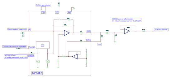 The current source needs to be low capacitance, less than 1.5pF, to maintain the bandwidth. The output needs to be high output impedance to control the loading on the OPA857’s output. Since most of the test equipments we have are 50W input and output impedance, how do we resolve that problem while not impacting bandwidth, slew rate or distortion performance of the DUT (Device Under Test)?