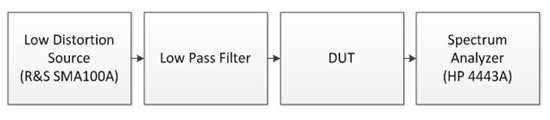 The low distortion source is further improved by using a high order filter. The dynamic range of the spectrum analyzer can be improved by filtering the fundamental and measuring only the harmonics. The setup is shown in figure 3. The notch filter that can is placed after the DUT is omitted in this diagram.