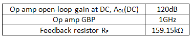 The first step of this analysis assumes an op amp with a single pole in the AOL response and the specifications shown in Table 1.