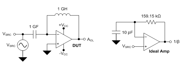An amplifier’s closed-loop stability is related to its phase margin, ΦM, which is determined by the loop-gain response defined as AOL × β, where β is the inverse of the noise gain. Figures 2 and 3 show the TINA-TI™ circuits to determine the op amp’s AOL and noise gain, respectively. Figure 2 configures the device under test (DUT) in an open-loop configuration to derive its AOL. Figure 3 uses an ideal op amp with the desired RF, CF and CTOT around it to extract the noise gain, 1/β. Figure 3 excludes parasitic elements CF and CTOT – for now.