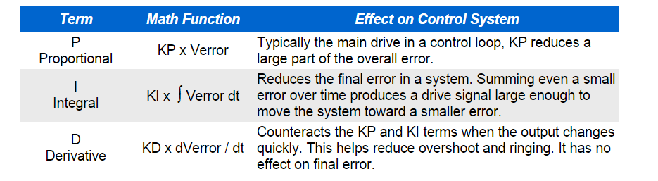 Tuning a system means adjusting three multipliers Kp, Ki and Kd adding in various amounts of these functions