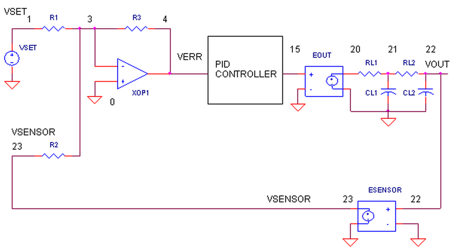 Any difference between Vset and -Vsensor, results in an error voltage at the output that the PID controller can act upon.