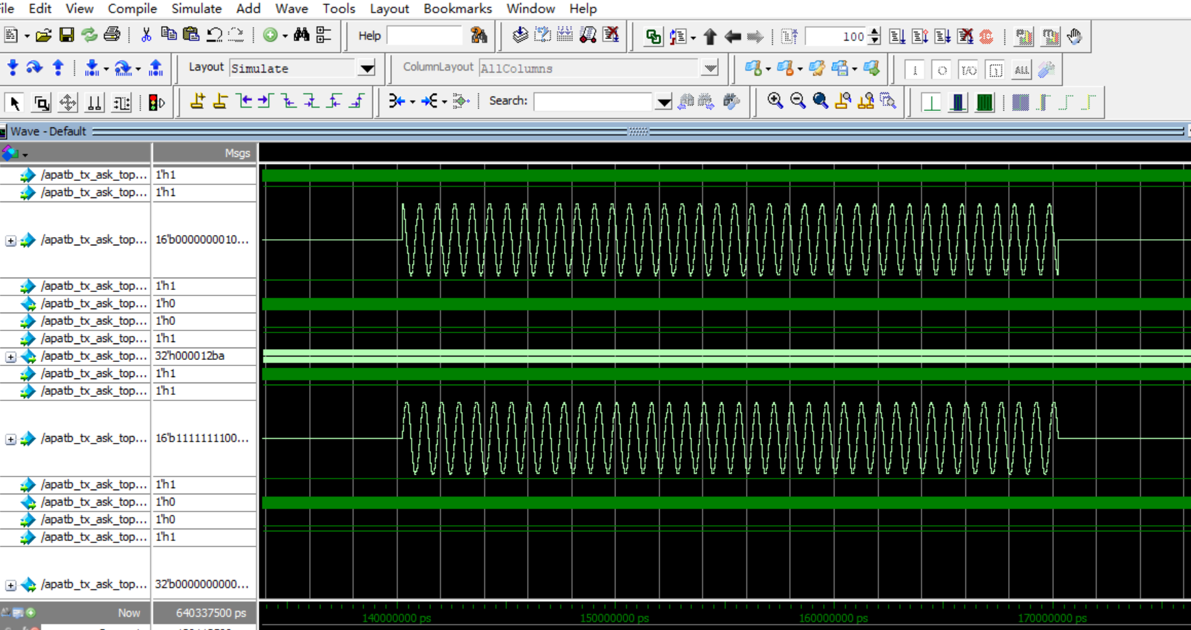 首先我们是用任意精度数据类型来定义我们的数据或者变量,ask 即就是当的需要调制的值是1时,输出其波形,输入数据为 0 时,输出为 0,当输入数据为 1时,输出 sin 与 cos。