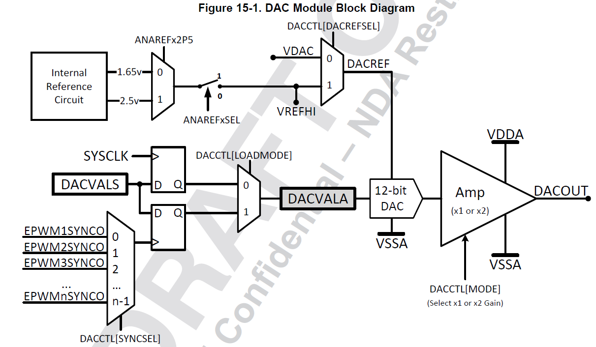F280049C内部包含两个12-bit的DAC内核DACa、DACb,可以产生多种波形,比如正弦波、方波、锯齿波等。可选内部参考源1.65V或2.5V、外部参考源,输出增益可编程x1、x2。DAC内部框图如下所示: