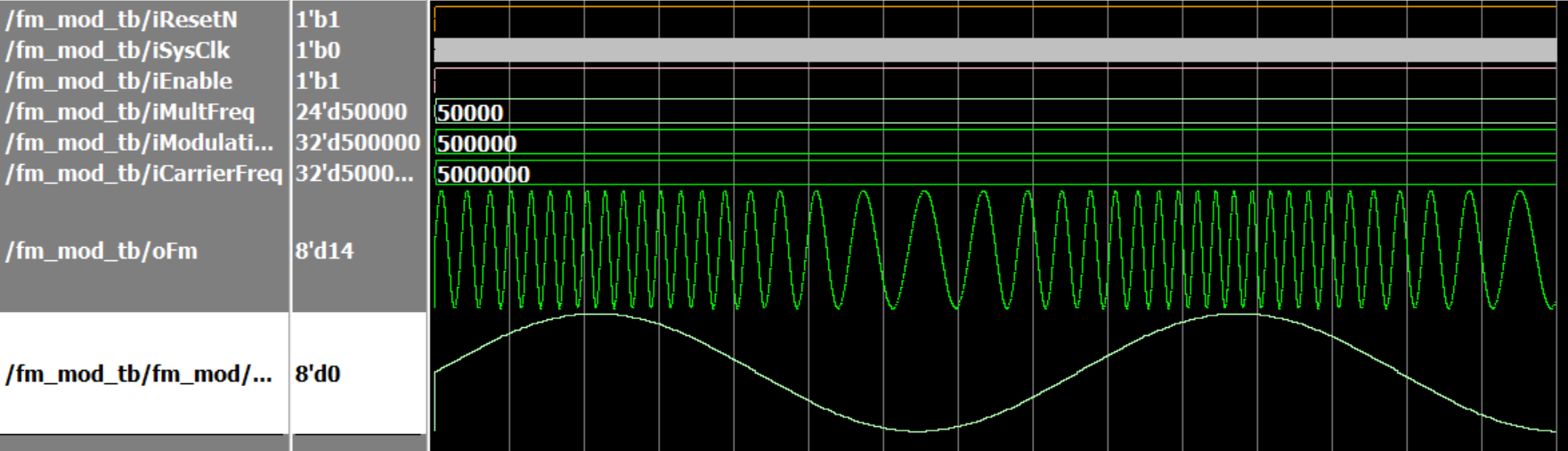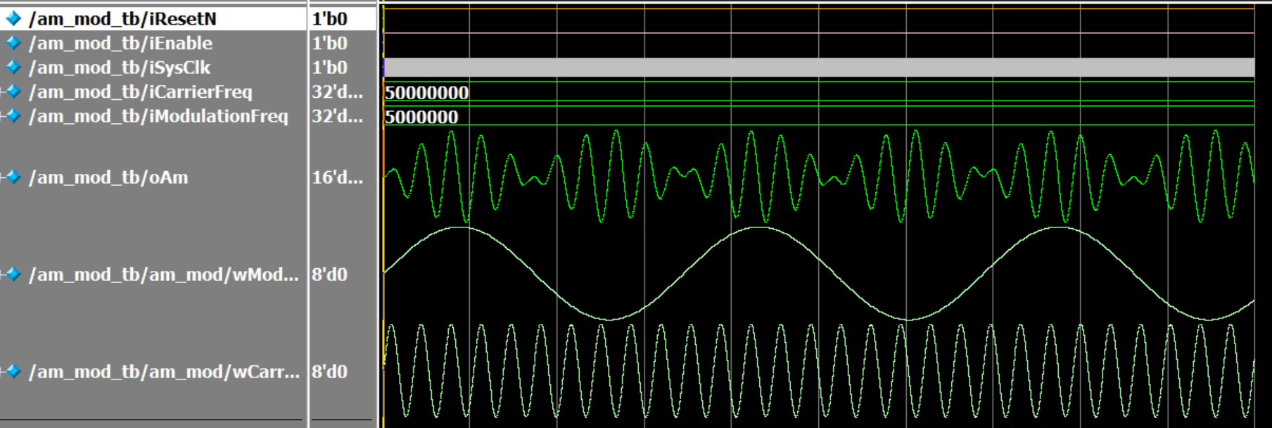 由于正弦表一般为无符号数,所以要转为有符号数,再送进乘法器,最终可以得到AM已调信号。(乘法器需要使用IP,为全并行乘法器)