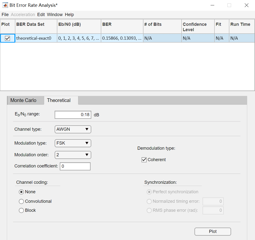 相干与非相干FSK解调性能,可以使用matlab的bertool来得到,打开bertool,设置相应的参数,即点击plot即可得到BER对比结果。