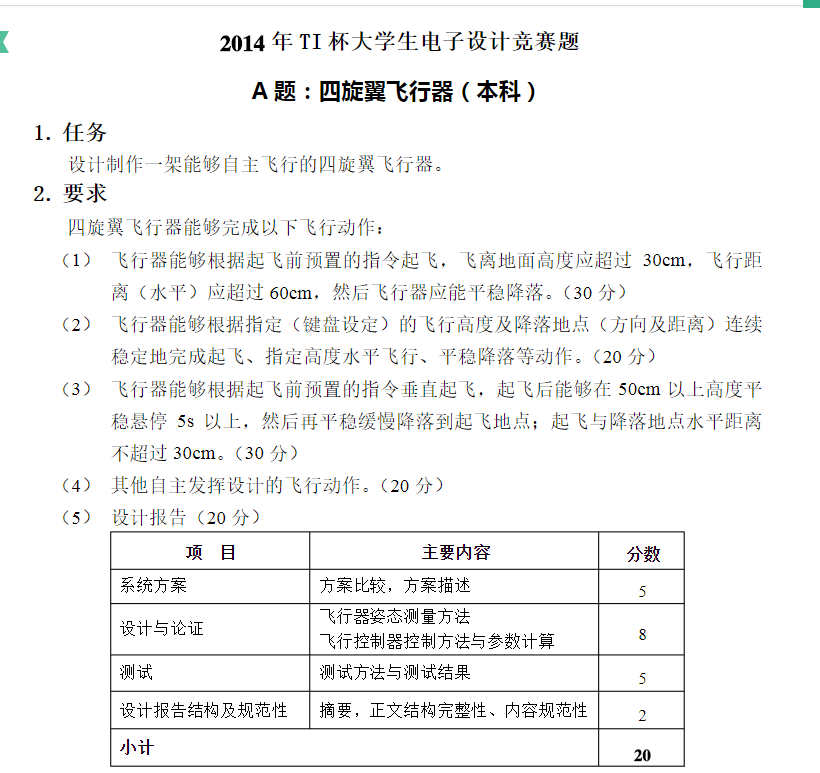 2014年TI杯大学生电子设计竞赛四川省赛题-A题四旋翼飞行器