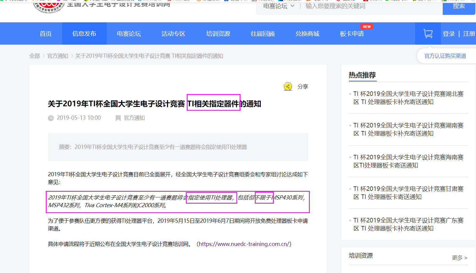 答:是,电赛根据官方通知,2019年TI杯全国大学生电子设计竞赛至少有一道赛题将会指定使用TI处理器,包括但不限于MSP430系列,MSP432系列,Tiva Cortex-M4系列和C2000系列。根据电赛官方培训网站上芯片教程对飞控所需要用到的资源有着重介绍,以及以往TI省赛飞行器处理器限定TI平台,按上面这个逻辑来推理,2019年TI国赛控制组中的飞行器处理芯片限定采用TI处理器基本可以坐实(99.999999%+)。