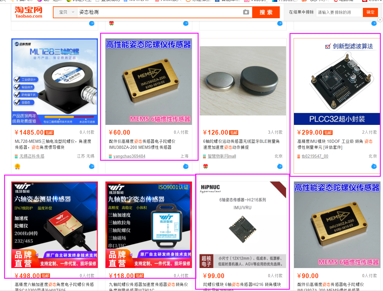 答:根据以往TI省赛的要求,飞行器的姿态检测与飞行控制必须使用TI公司的处理器,评测专家需要根据电路板判断TI处理器真实处理了姿态检测与飞行器控制两个部分。首先姿态检测和飞行控制虽然字面很短,实际意义却很丰富,首先讲姿态检测,随着MEMS技术的发展,当前飞行器姿态传感器已经很少见早期航模时代的模拟加速度计、模拟陀螺仪了,主流的姿态传感器与处理器采用数字通讯的方式,如SPI、I2C等。针对单一的常见惯性传感器而言,如MPU6050、ICM20689等,MPU系列是内置DMP(数字运动处理器)解算的,用户可以仍然采用数字通讯的方式直接获取姿态四元数,初始化采样率、量程,校准加速度零位,开启DMP后,MPU内部会自动完成加速度、陀螺仪(磁力计可选)四元数姿态融合过程,外部处理器直接可以通过MPU6050自带的DMP函数mpu_read_fifo函数获取姿态四元数、角速度、加速度数据,得到姿态四元数后通过四元数旋转矩阵与方向余弦矩阵对应关系,通过三角函数运算即可得到姿态数据。若用TI处理器采用DMP读取的方式获取MPU6050姿态传感器数据并最终得到用于飞行器控制的姿态反馈数据。很显然这肯定属于组委会所要求的——采用TI处理器处理飞行器姿态检测的范畴。虽然处理器只是做了初始化配置、数字通讯得到姿态四元数、反三角运算得到姿态反馈。TI处理器省去了像不带的DMP数字惯性传感器,需要TI处理器外部去更新DCM/四元数的过程。之所以做上述陈述是针对引出复杂的实际现状的需要,下面来看一下市面上能买到的姿态测量模块,下面我们去马云家搜下:姿态测量,出来的结果如下