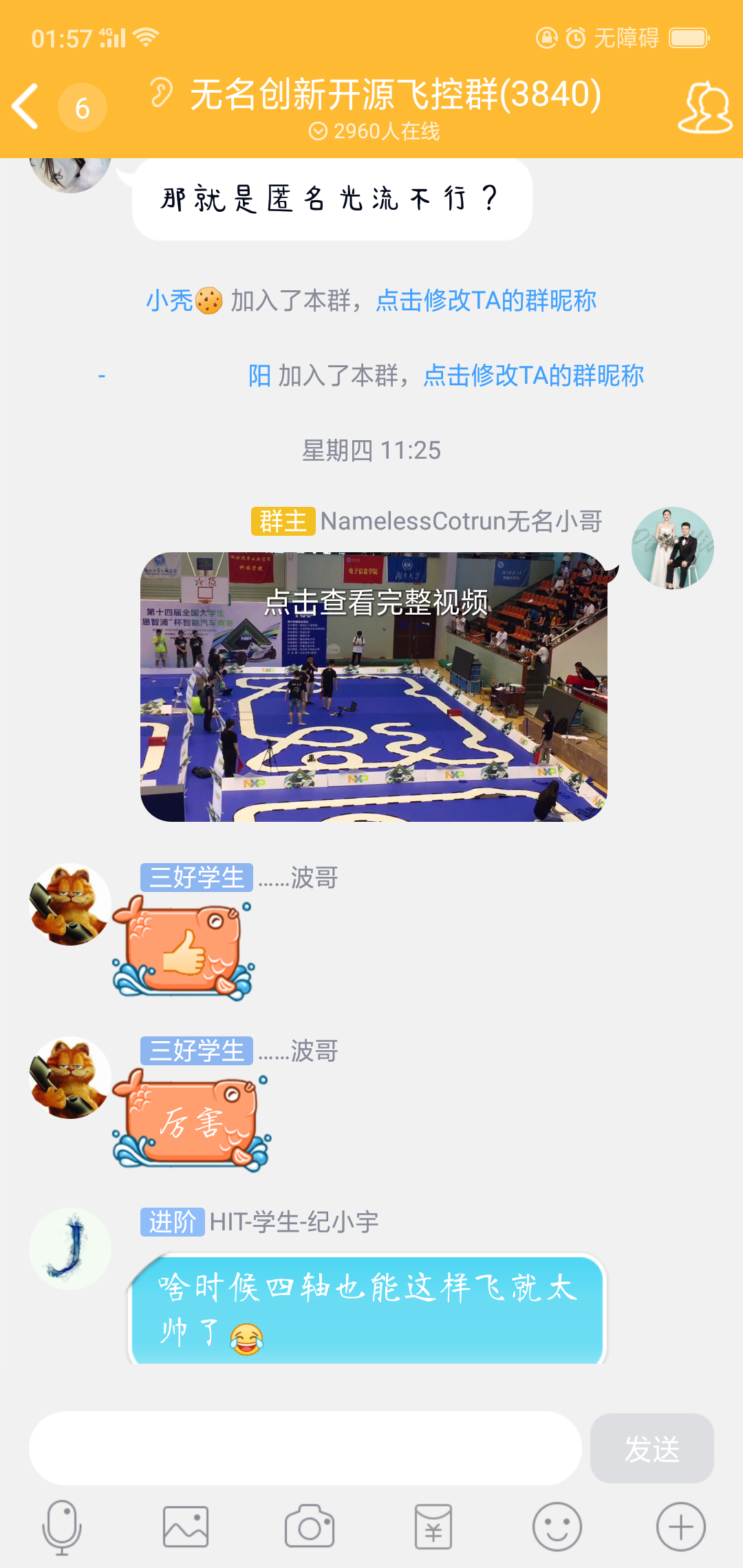个人猜想目前电赛飞行器赛题考虑到实际水平和该赛题的实际参与现状,没有限定成品飞行器是为了鼓励更多的人参与进来,培养更多无人机行业方向的工程师,等到大家整体实力起来后,传承帮带好,积累相关经验,类似恩智浦智能车竞赛限定自己设计飞控,统一竞赛机型,自然就水到渠成,现在这个时候限定自己设计飞控,绝对是一片哀嚎,不符合实际情况。大家技术都成熟了,后面电赛专科组开设飞行器赛题也不是不可能。下面贴出无名创新客户自己造轮子自主设计飞控的照片。