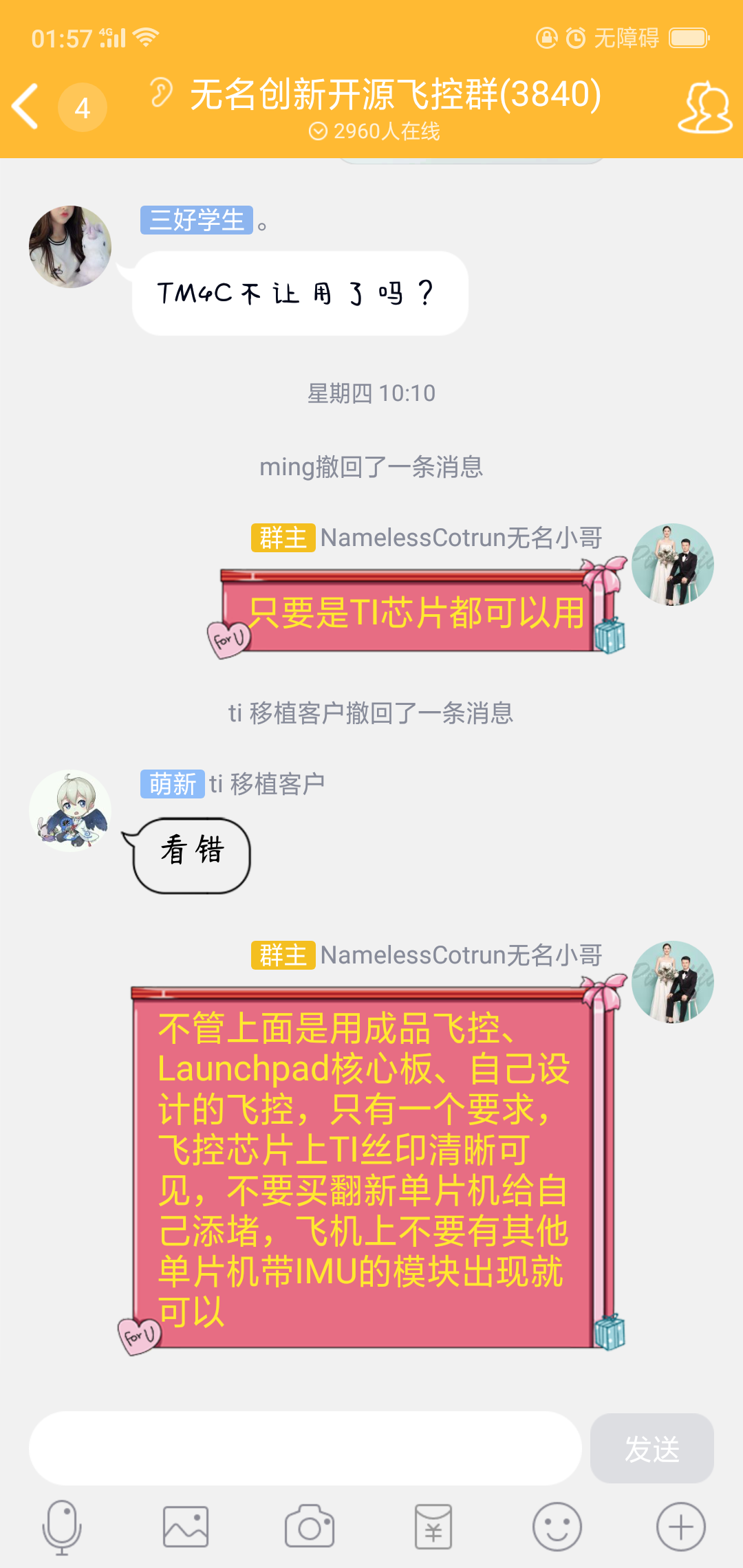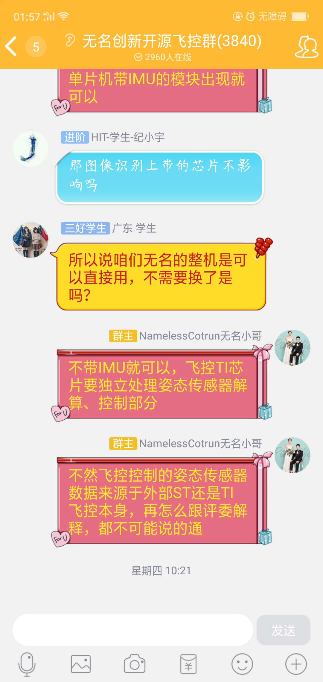 情况介绍:我们发布了新款MSP432版本飞控,将光流惯导融合方案开源,在自家技术交流群里发照片宣传,有人提问出新款MSP432,是不是比赛不让用TM4C了,我回复只要是TI芯片都可以,顺便提醒下独立设计飞控的同学,不要买翻新丝印不清晰的芯片,考虑到竞赛要求的所述的TI主控必须独立处理姿态检测部分,建议不要用其它其他协处理器不要有IMU部分,如带新唐、ST的姿态检测模块、视觉惯性里程计等,不然很难跟评审专家解释。结果有人回复是不是匿名那家ST带IMU、高度检测的光流不能用?考虑到接着回复会引起不必要的误会,同时会增加对方对一直以来我们的敌意,没有予以回复。