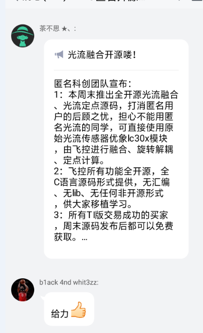 1:本周末推出全开源光流融合、光流定点源码,打消匿名用户的后顾之忧,担心不能用匿名光流的同学,可直接使用原始光流传感器优象lc30x模块,由飞控进行融合、旋转解耦、定点计算。