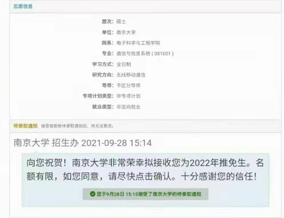其次是南大。机缘巧合地入营了南大,面试主要是围绕着所感兴趣的方向、专业课的理解、英语提问(六级高所以免试)、政治问题以及简历相关等提问的。还有你有没有学过电子类专业课,对某个理论有什么认识这类的题目,如实回答就可以了,乱说反而会让自己的形象大打折扣。当然也不是回避不谈,不会的话可以说“这个问题我之前没有仔细研究过,但是我有以下想法,不足之处还请各位老师批评指出”,彰显自己谦虚的态度,老师更重要的是看你的思路和涵养。